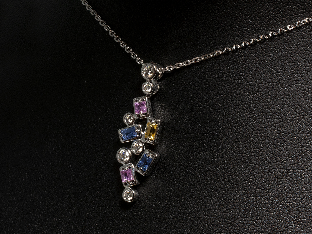 A colourful and modern pendant featuring 6 sparkling Round Brilliant Cut Diamonds totalling 0.27ct. The diamond set bale holds scattered Baguette Cut Sapphires in pink, blue and yellow adding a burst of colour to this vibrant design. Eye catching and unique, this pendant necklace is an easy to wear design that would be treasured by anyone.
