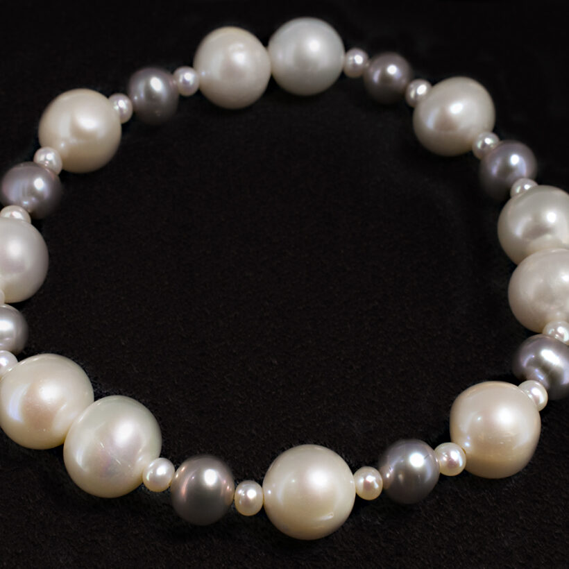 This two tone pearl bracelet features contrasting white and grey fresh water pearls. The delicate cream hues make this bracelet a perfect match for any bridal look while retaining an everyday wear feel. This pretty design will become your go to bracelet to wear on its own or stack with other pieces.